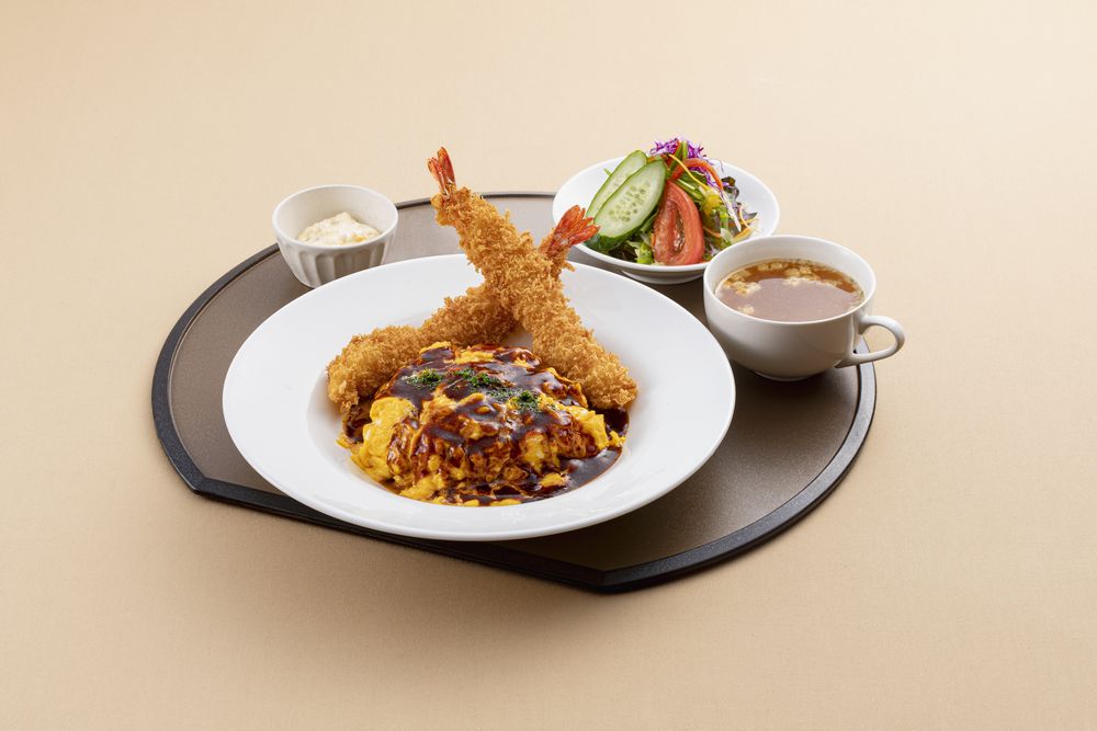 チキンライスをふわとろ卵で包み込み、じっくり煮込んだ特製デミグラスソースで仕上げました。海老フライと一緒にお愉しみください。