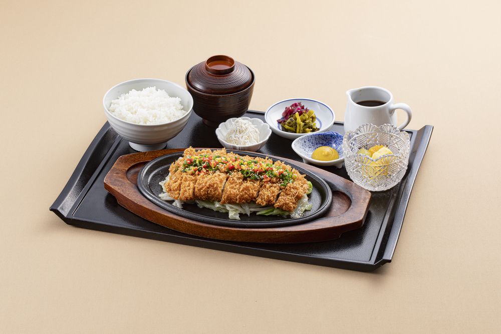 美明豚の揚げたてかつを熱々の鉄板に盛り付けました。甘味のほどよい八丁味噌ベースの特製ソースをかけてお召し上がりください。