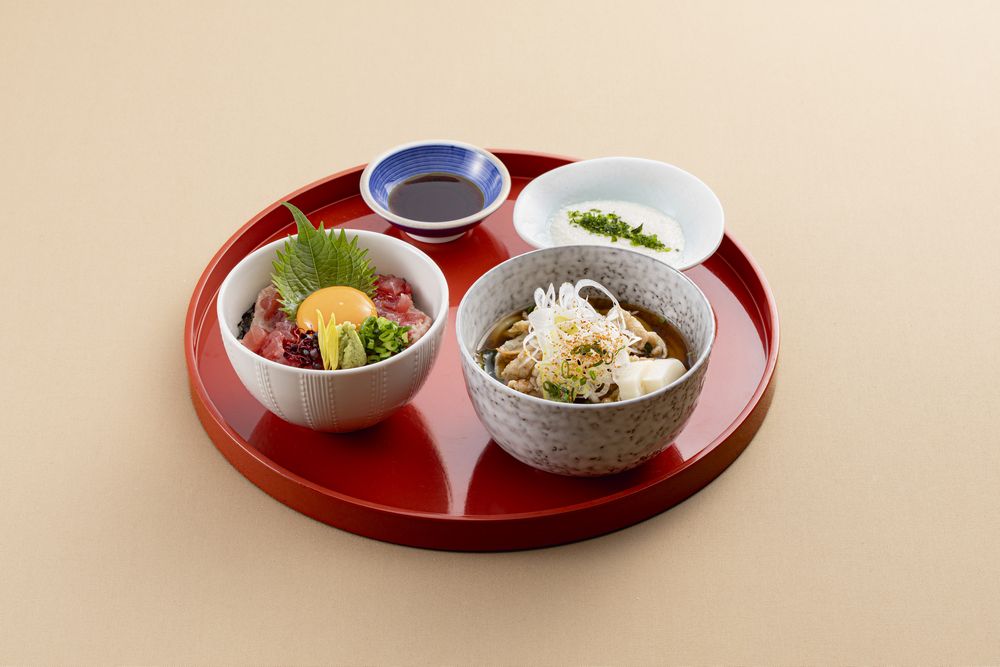 特製たれで味付けた豚肉とかみごたえのあるうどんをまろやかな和風だしで仕上げた肉うどん。鮪ねぎとろ丼と一緒にご賞味ください。
